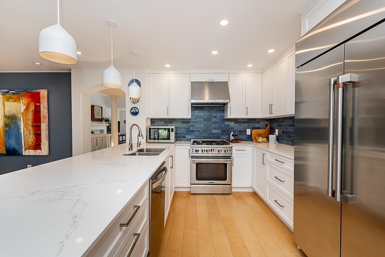 Professionally renovated modern coastal townhome with mountain and partial ocean views in the gated community of Oliver’s Landing. Beautifully updated open plan living area featuring wood laminate floor, cathedral ceiling, decorative fireplace, library, and covered balcony. Gourmet kitchen with quality cabinets, task lighting, quartz counters, tile backsplash, Bosch, Cafe, Capital, LG stainless appliances, & built-in wine cooler. Walk out from the dining room to a private patio with fire table. Upstairs, ocean-view primary with vaulted ceiling, spa-like ensuite, guest room with mountain views and ensuite, plus open loft for office. Lower level flex space and full bath. 2-car garage and ample storage. Rec centre membership. 55 mins to Whistler or downtown. No Foreign Buyer/Spec/Vacancy Tax.
